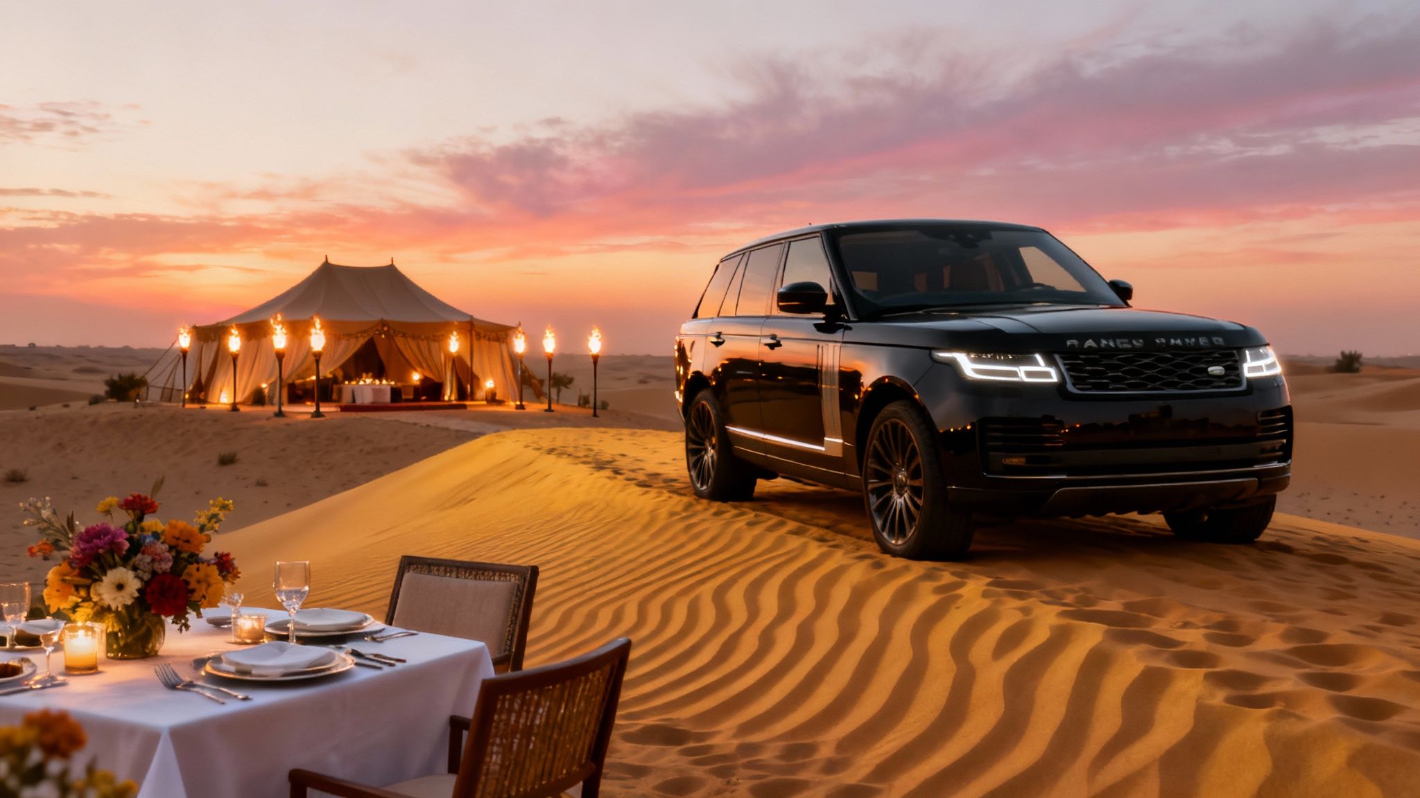 It all begins in the afternoon with the quiet arrival of your private, high-end 4×4. Seeing a pristine Land Rover Defender or a classic, open-top 1950s Land Rover pull up is the first sign that this is something special. Your professional guide greets you, and as you settle in with a chilled water, they'll give you a brief overview of the evening ahead while you glide away from the city's futuristic skyline.